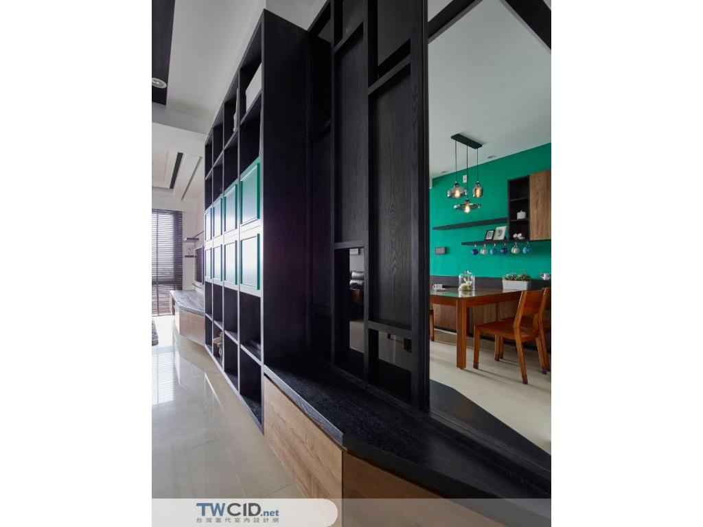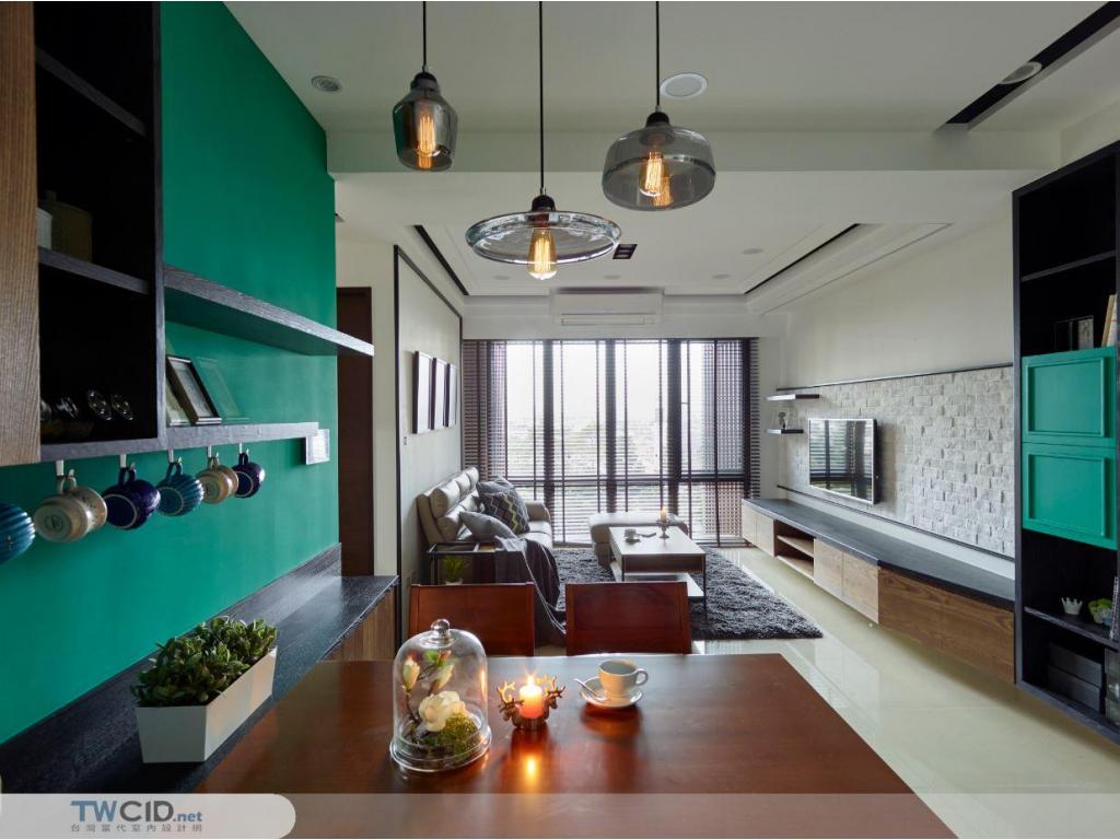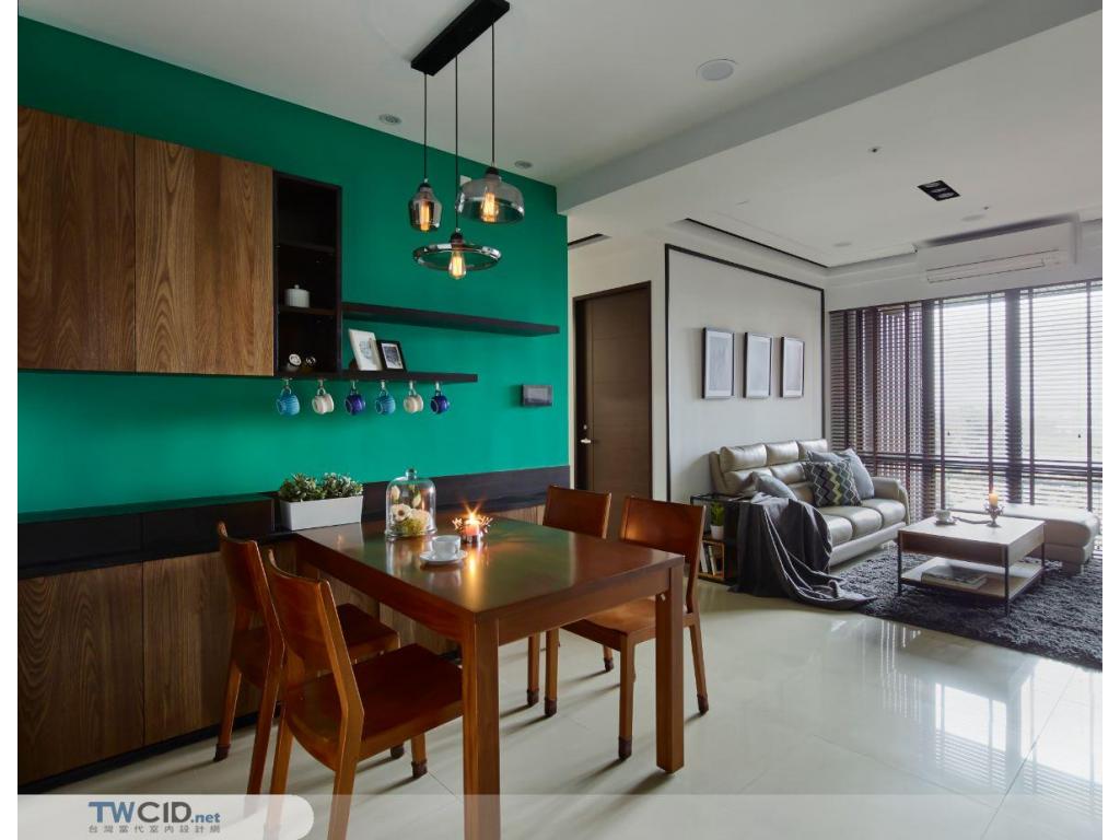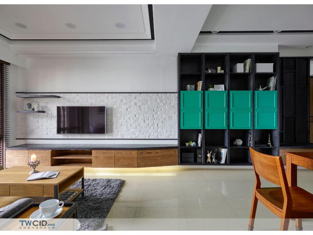 延展的櫃體使空間連貫在一起, 視覺底端是美好的自然框景, 透進室內的自然光呈現清爽感。 玄關鏡子將空間營造出另一種對稱型態; 搶眼綠與內斂黑相輔之間以自然木頭紋路點綴其中, 烘托出空間的另一種氛圍。