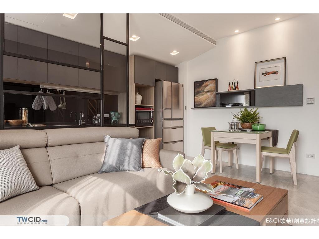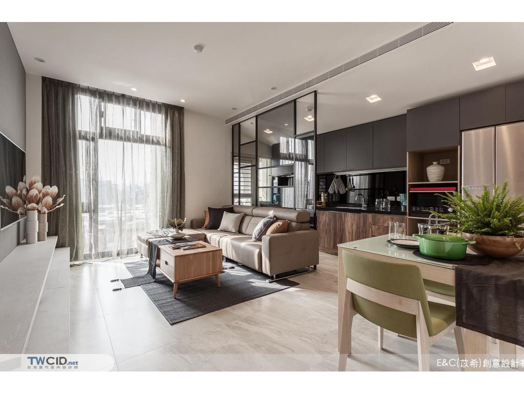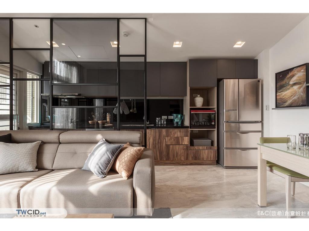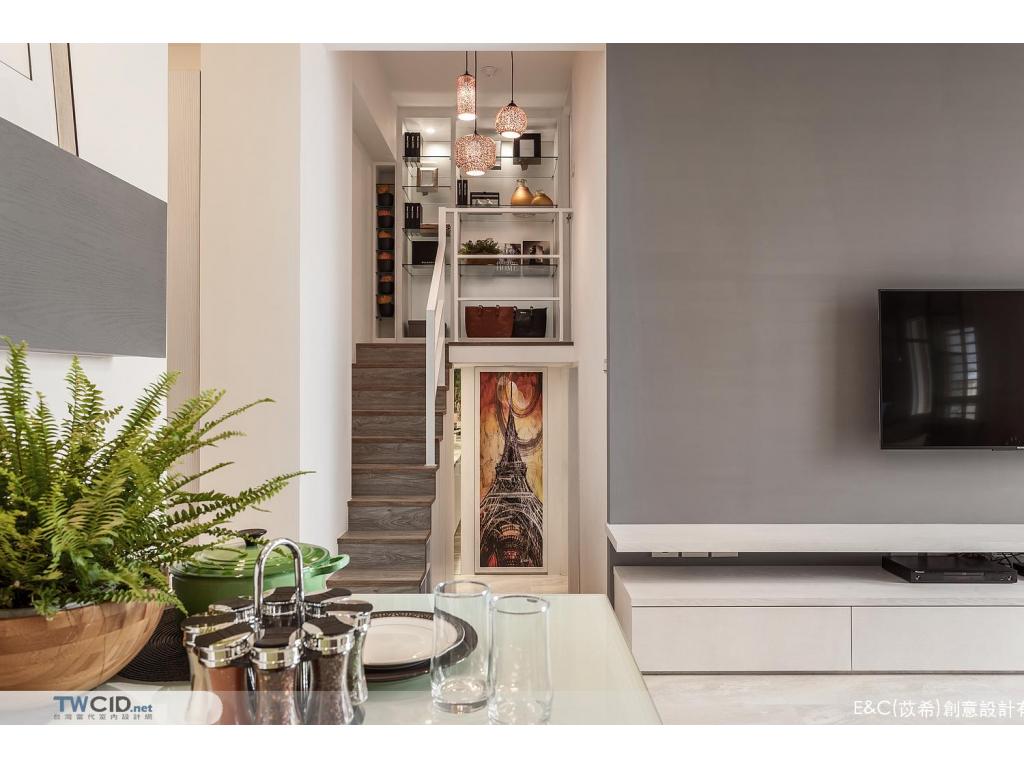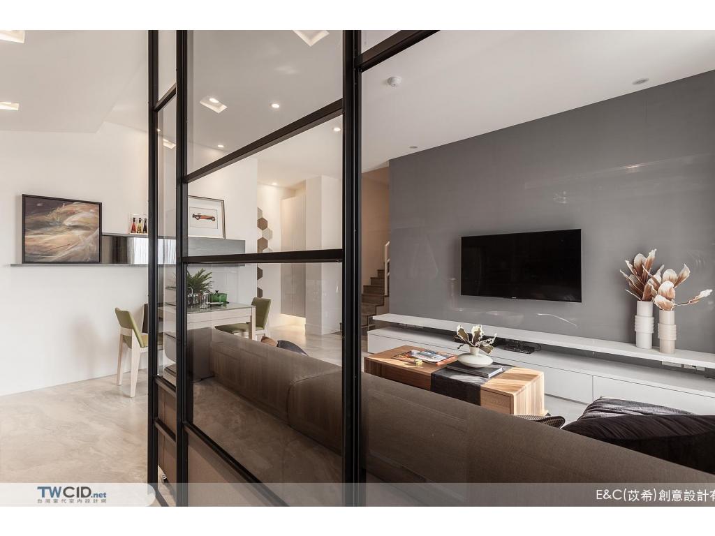 進入內部,E&C (苡希)創意設計將獨立廚房牆面拆除,以清透的玻璃屏格取代沙發主牆,用開放的視角,擺脫空間上種種限制,並以生活品味為主軸,透過垂直動線緊密串聯公私場域,體現對屋主對生活的企求。此外,更融入設計巧思及收納需求,在餐廳展示櫃、櫥櫃、電視機櫃與梯間等處,都發揮了最大的潛能,豐富空間的層次與使用性。