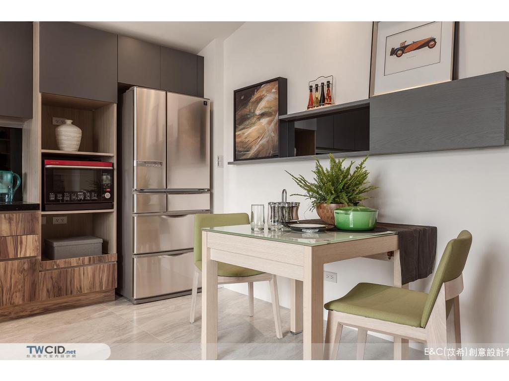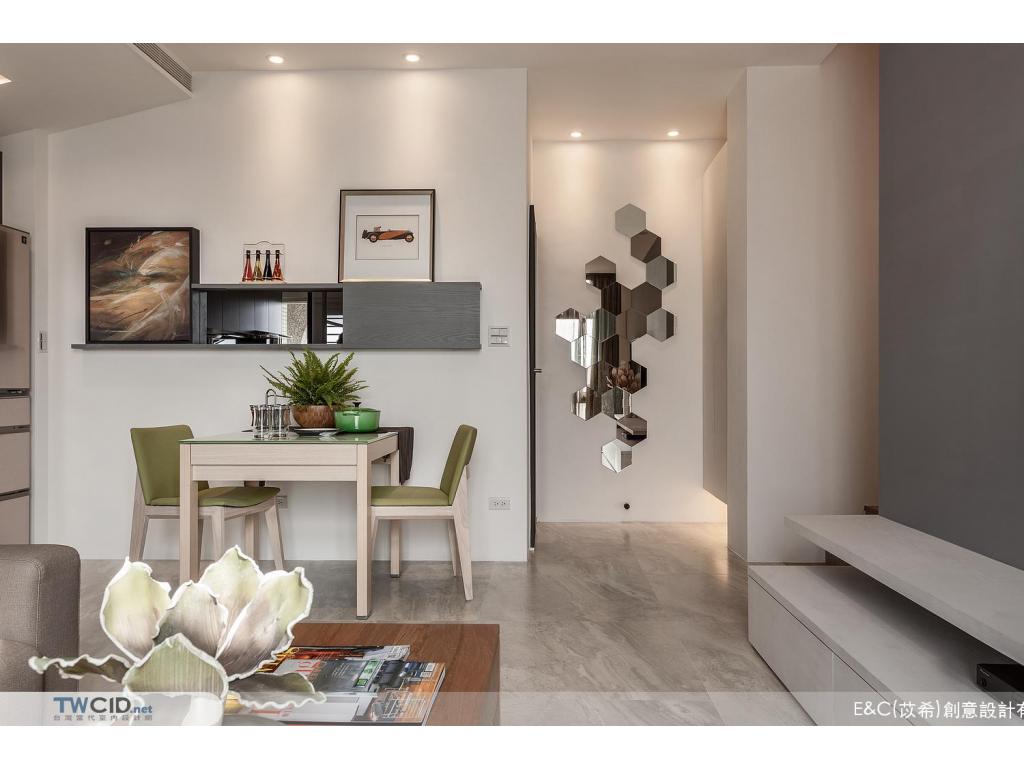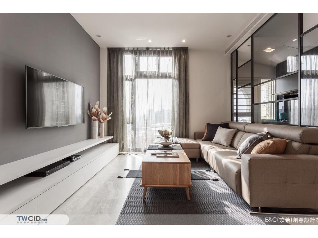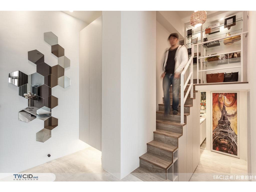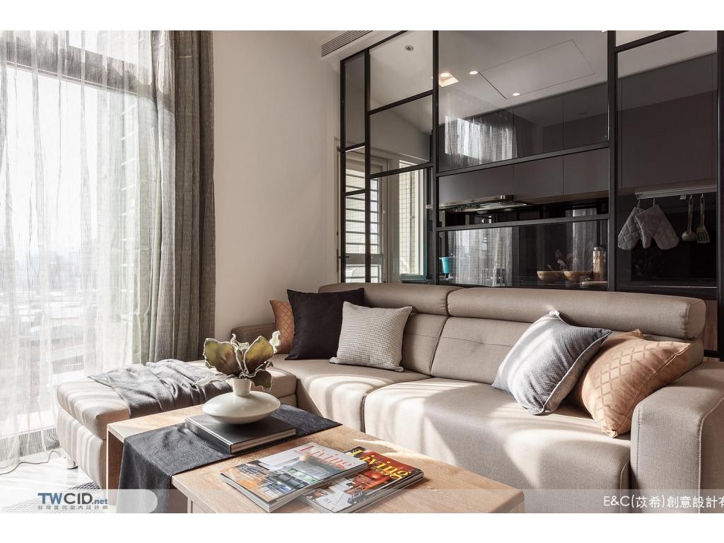進入內部,E&C (苡希)創意設計將獨立廚房牆面拆除,以清透的玻璃屏格取代沙發主牆,用開放的視角,擺脫空間上種種限制,並以生活品味為主軸,透過垂直動線緊密串聯公私場域,體現對屋主對生活的企求。此外,更融入設計巧思及收納需求,在餐廳展示櫃、櫥櫃、電視機櫃與梯間等處,都發揮了最大的潛能,豐富空間的層次與使用性。