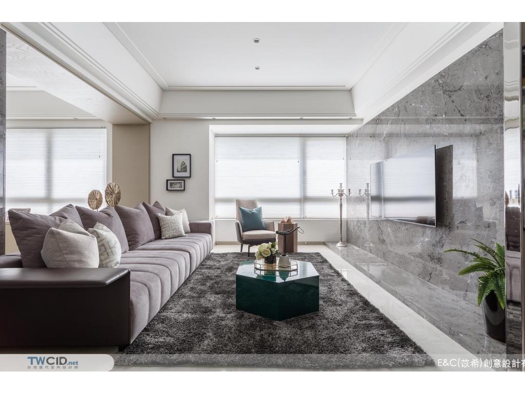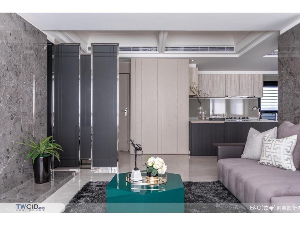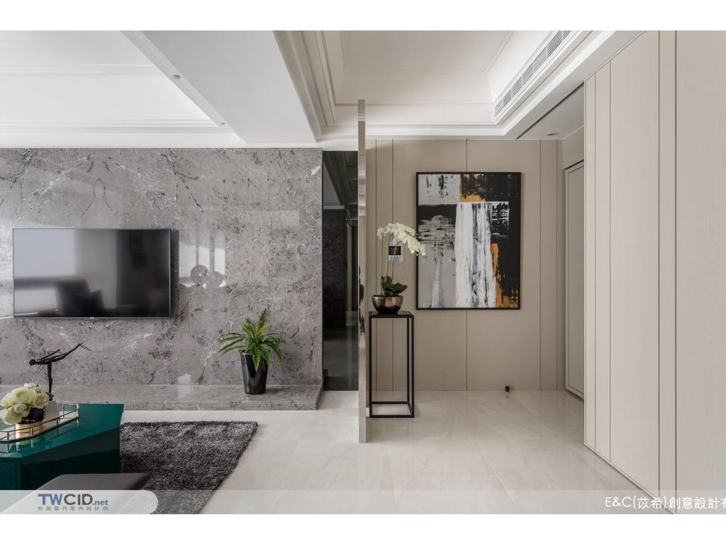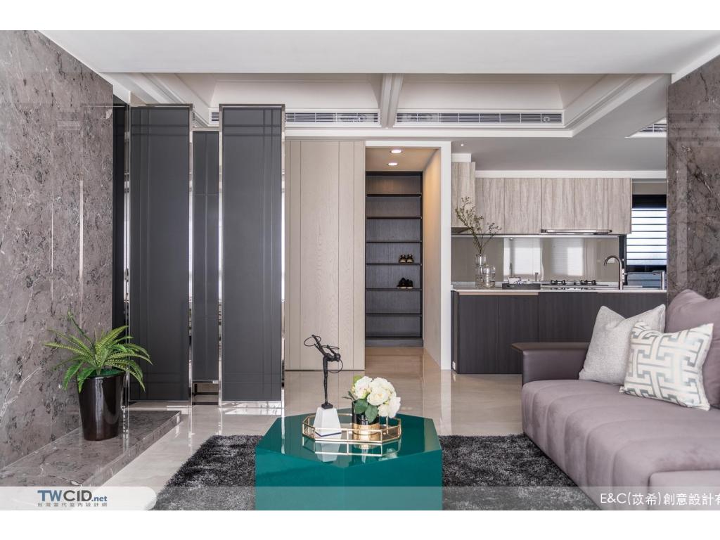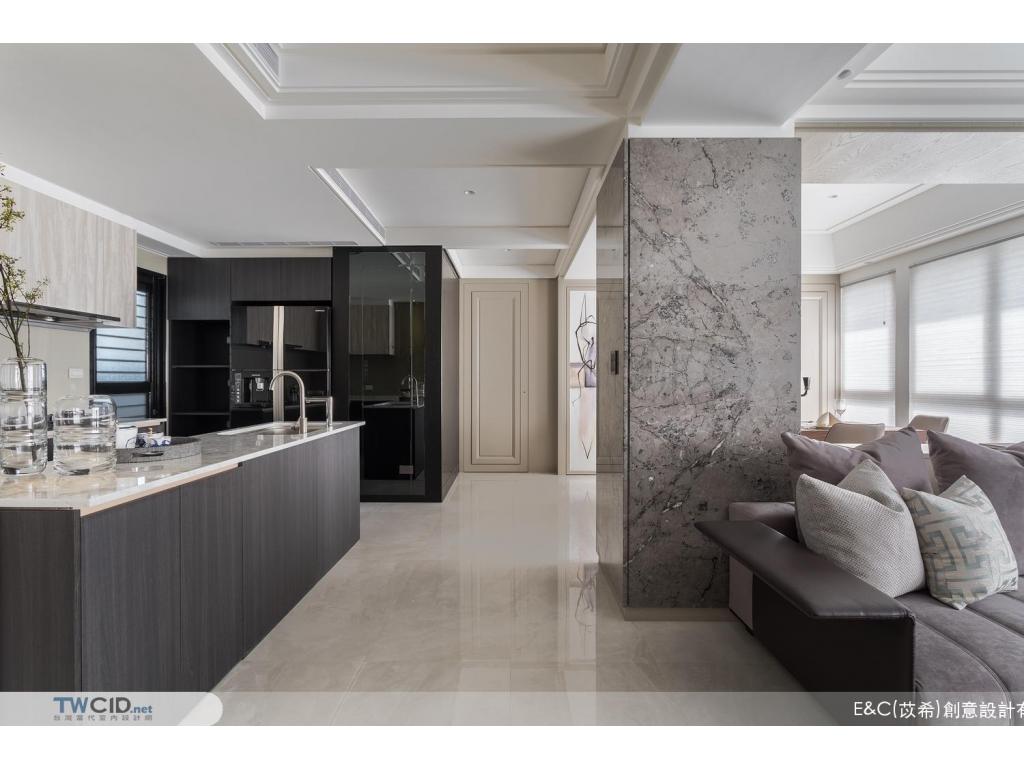 | 設計內容 | 視覺焦點 客廳有一個80x80cm寬的結構柱體,E&C (苡希)創意設計將劣勢化為優勢,除了採用石材做包覆外,加上天花板上的樑柱整合,營造整體的視覺焦點。
