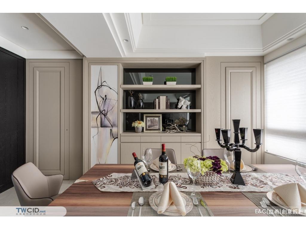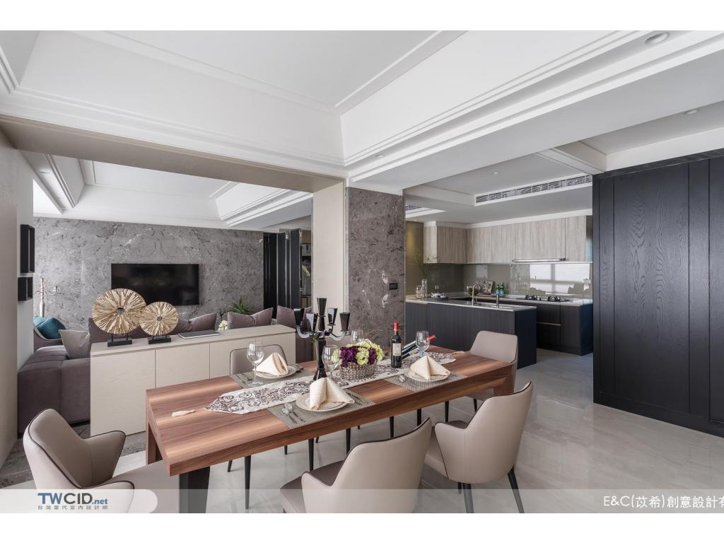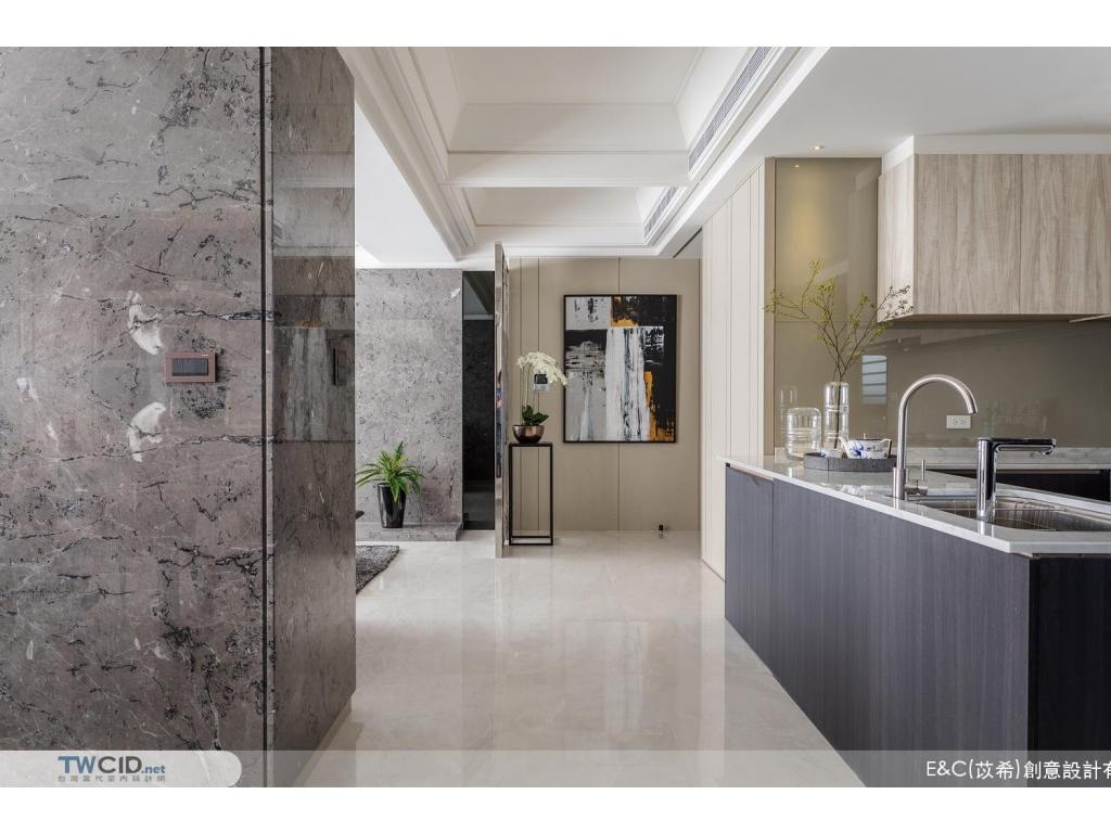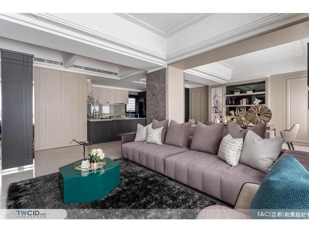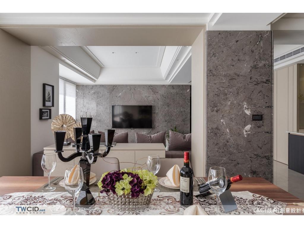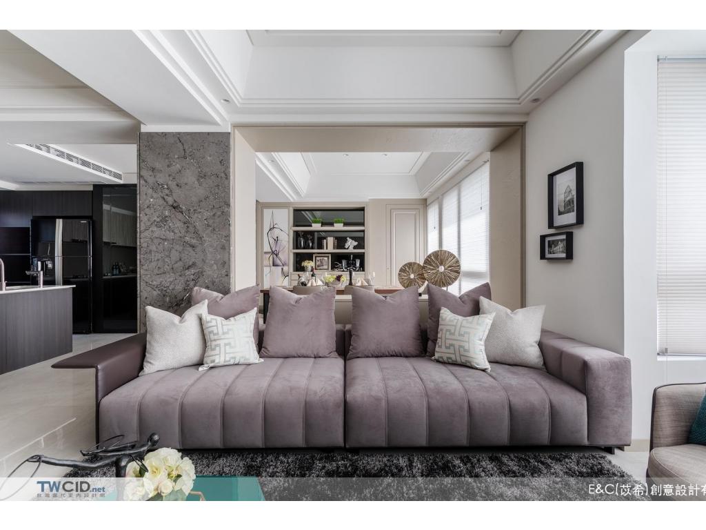 | 設計內容 | 視覺焦點 客廳有一個80x80cm寬的結構柱體,E&C (苡希)創意設計將劣勢化為優勢,除了採用石材做包覆外,加上天花板上的樑柱整合,營造整體的視覺焦點。