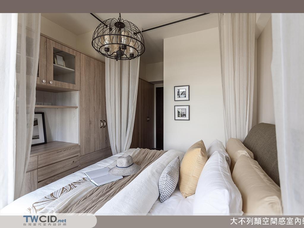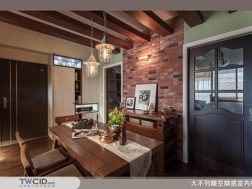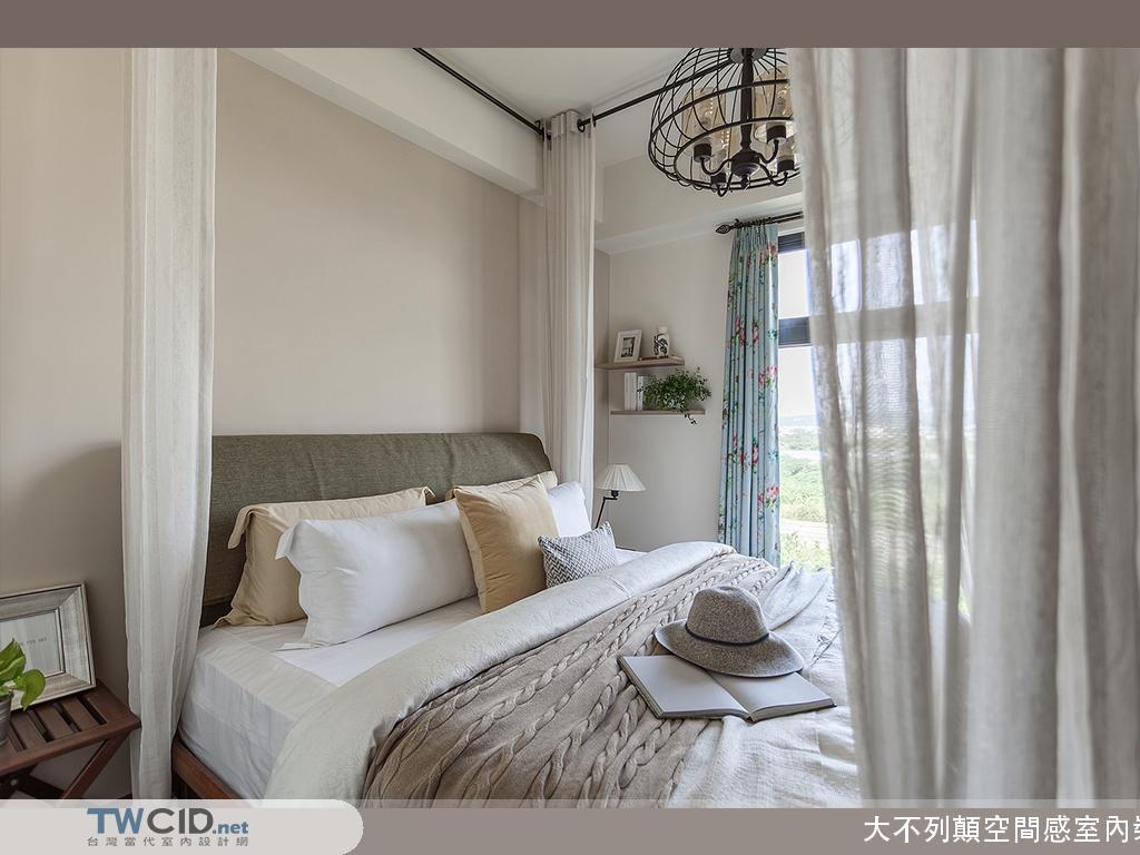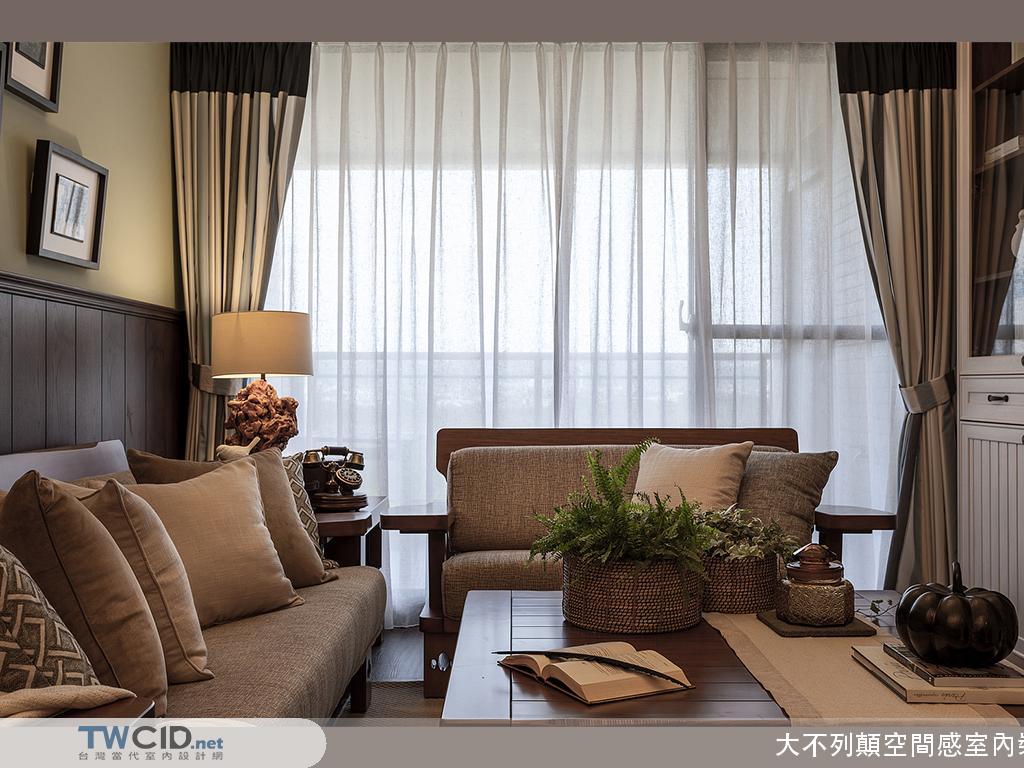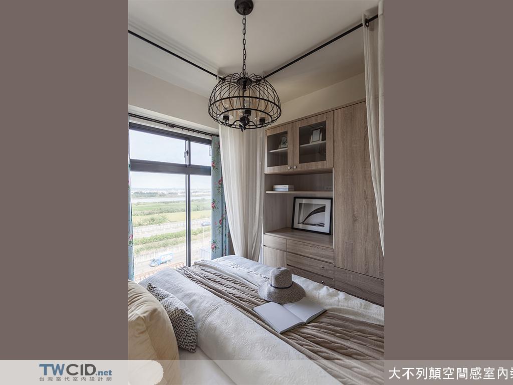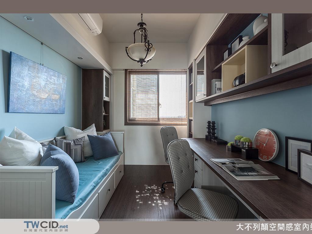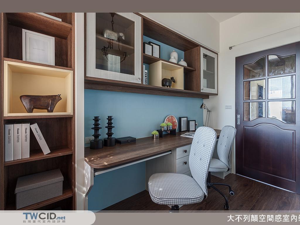 運用英式古典的深色系空間,搭配美式鄉村元素、紅磚文化石牆和木樁天花板,整體空間溫馨又休閒。 書房牆面採用藍色系,搭配深色系統櫃和竹捲簾,讓書房空間明亮又有特色。 主臥房除了基本的衣櫃收納外,特別設計了床紗,透過床紗欣賞落地窗外的海景,浪漫滿點~~